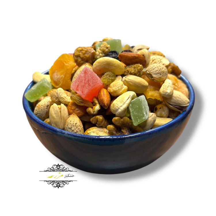 ترکیبات: پسته کله قوچی/بادام هندی/مغز بادام/منقا/مغز گردو/کشمش سبز/ مویز/توت خشک/مغز فندق/انجیر/انجیر کردی/برگه زردآلو/باسلوق میوه ای